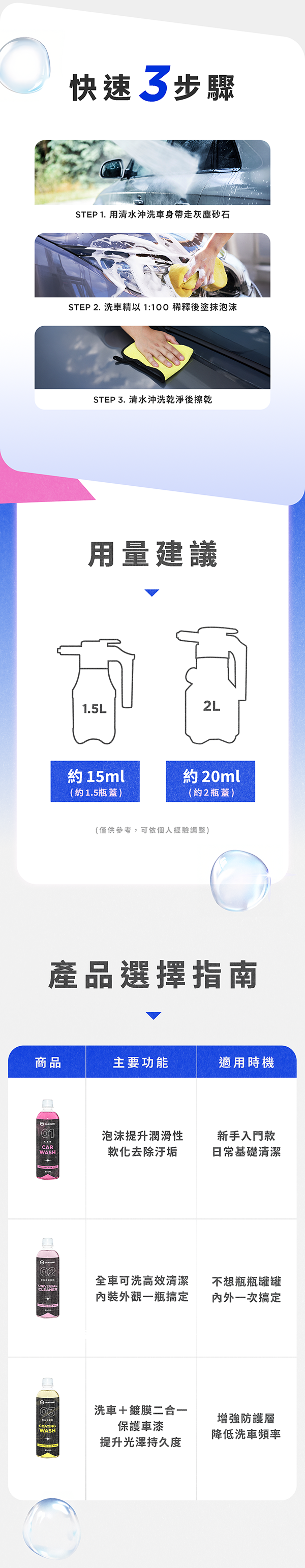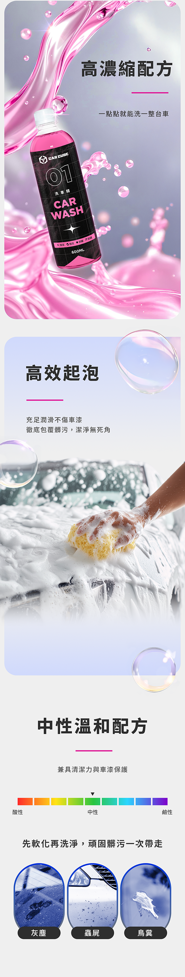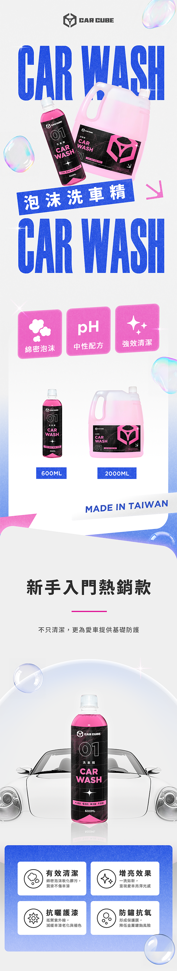 Carcube 洗車精 600 ml 濃縮高泡配方,能有效去除灰塵、油漬與污垢。泡沫綿密細緻,不傷鍍膜層,維持車漆光滑亮澤。操作簡單,讓汽車洗車與美容更省時省力。